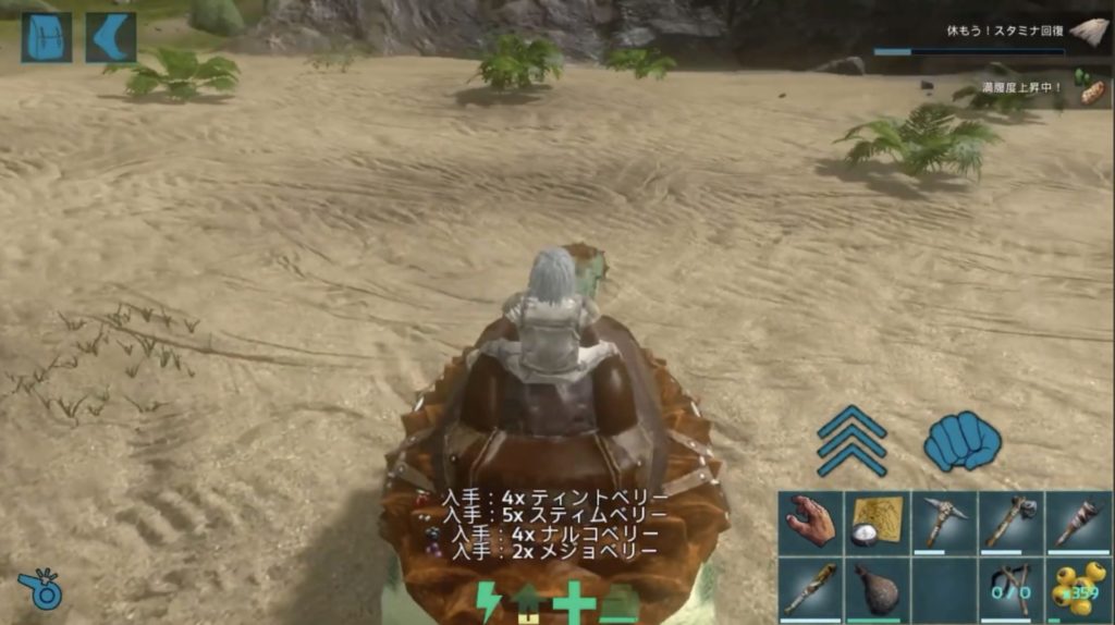 サドルを作成し、カルボネミスに乗る準備が整ったところで、いよいよ実戦投入!カルボネミスは、ベリーやワラを集めるのが得意なため、素材集めにはもってこいの存在です。実際に試してみると、予想通りベリーやワラを大量に集めてくれるので、これからの冒険が一気に楽になりそうです。